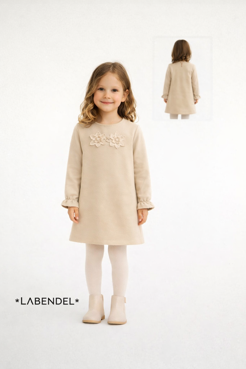 Vestido beige con 2 flores en montaine para nena.Labendel