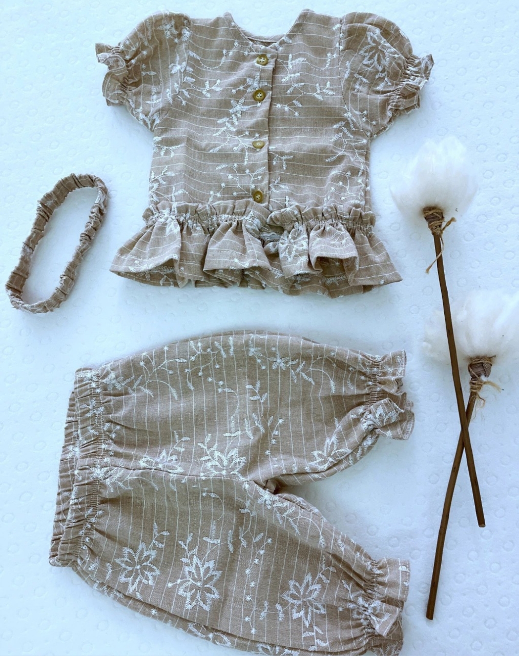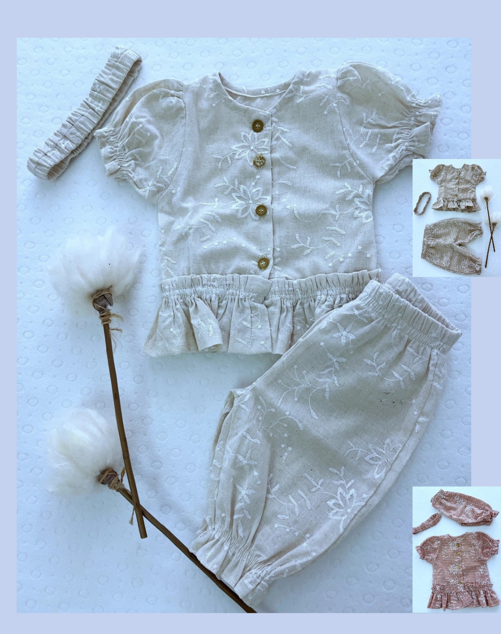SET LINO BORDADO BLUSA AMELI CON CAPRI Y VINCHA. COCOMIEL