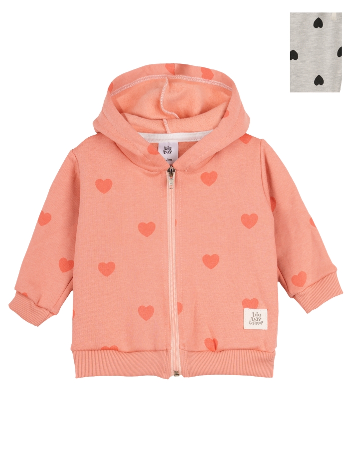 CAMPERA FRISA BEBA CON CIERRE Y CAPUCHA ESTAMPADO CORAZONES. BIG BAY