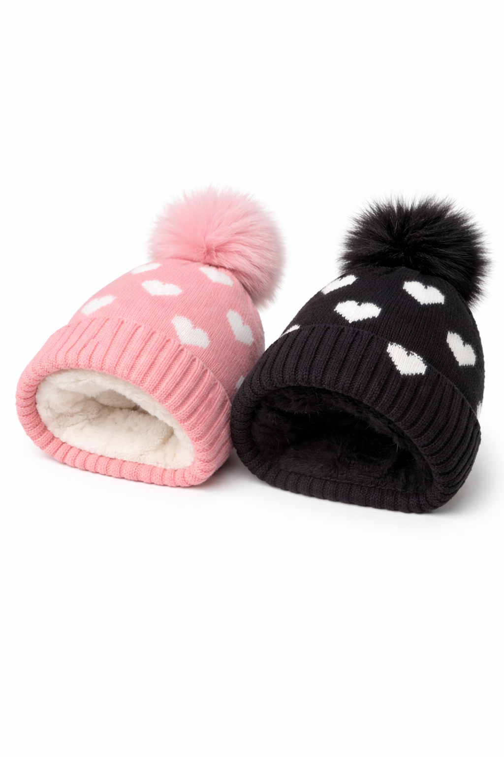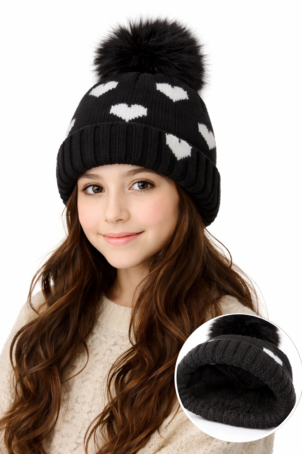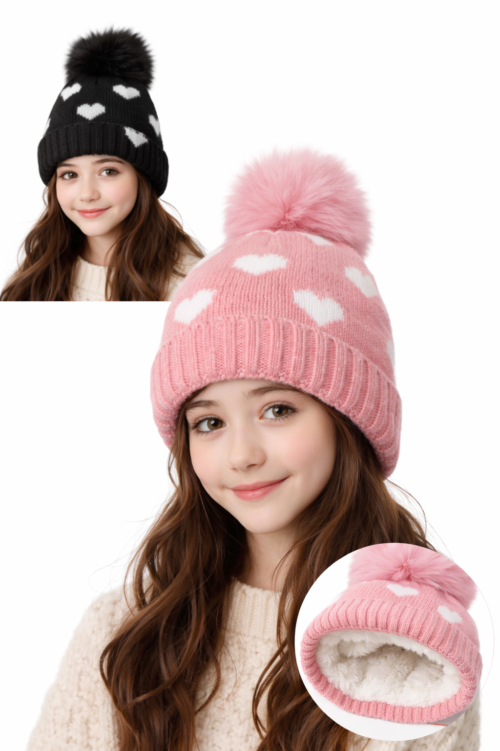 GORRO INFANTIL TEJIDO Y CORDERITO INTERNO. CON POMPON Y CORAZONES