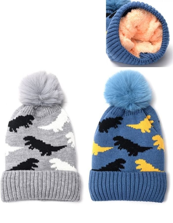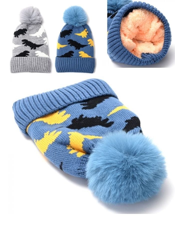 GORRO INFANTL TEJIDO CON CORDERITO INTERNO. POMPON Y ESTAMPA DINO